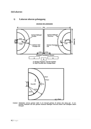 Gelanggang permainan Gelanggang permainan berukuran 20 meter kali 40 meter. JENIS PERTANDINGAN 21 Pertandingan secara. Gelanggang yang digunakan boleh merupakan gelanggang berumput di padang terbuka atau gelanggang bersimen atau berparket di dalam dewan yang tertutup.